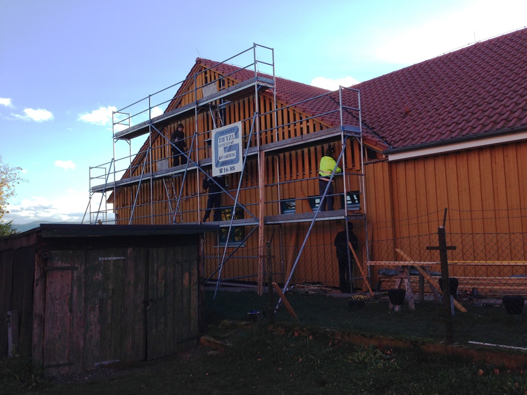 An mehreren Terminen im November wurde die Letzte "Baulücke" am Schulgebäude geschlossen. Die Eltern der freien Schule haben in Eigenleistung unter fachmännischer Anleitung die Giebelseite mit Fassadenbrettern verkleidet und gestrichen. Das Wetter konnte die Handwerker nicht bremsen, so dass der Giebel im November fertiggestellt werden konnte.